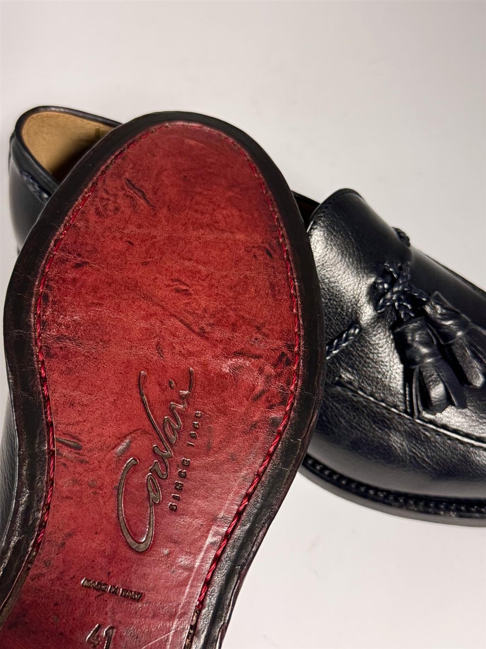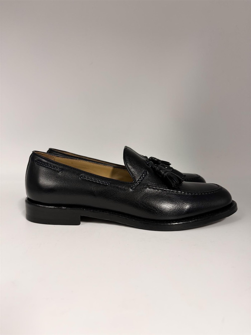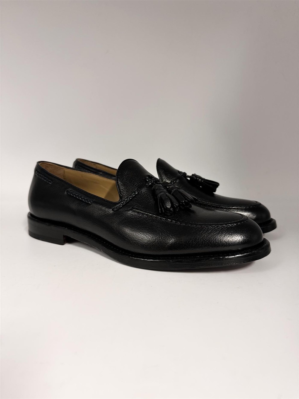 Mocassino in pelle nera con nappina e fondo cuoio Corvari
