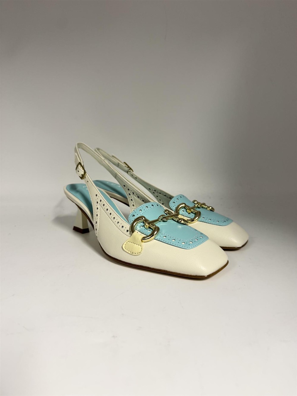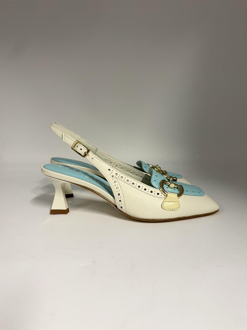 Slingback in pelle bianca e celeste con accessorio Luxury Brand Milano