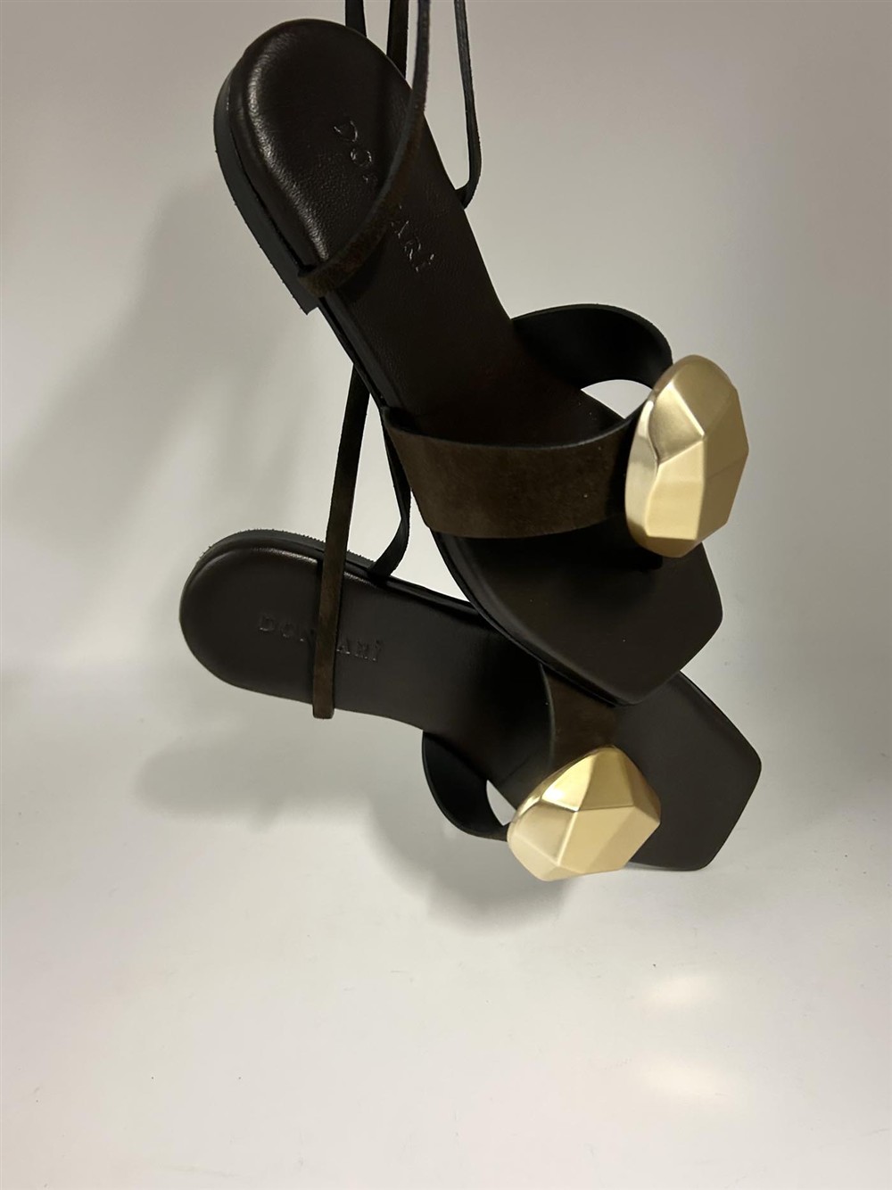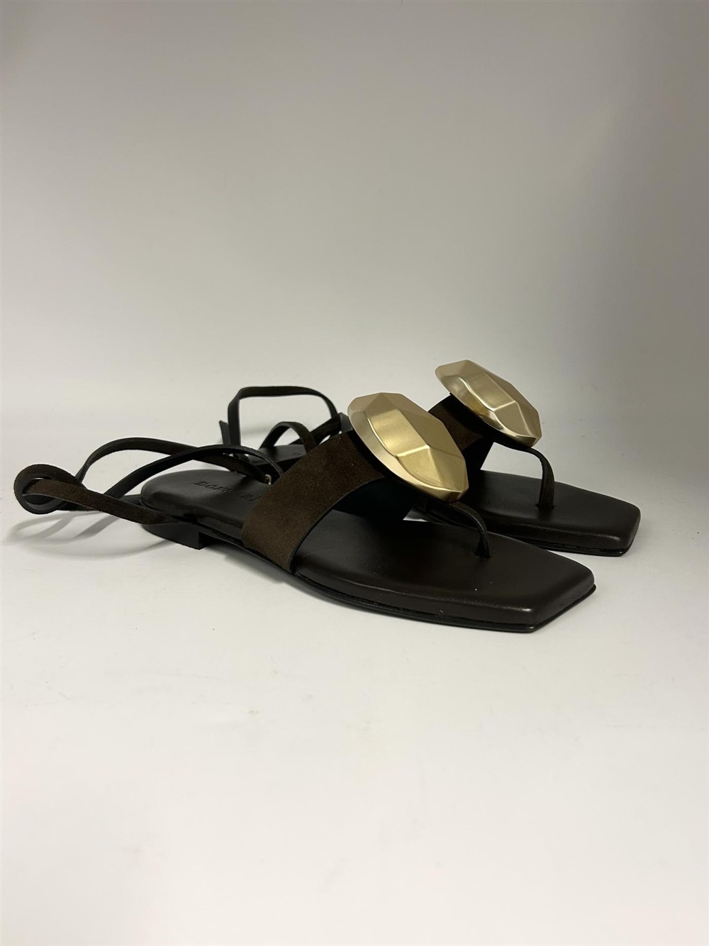 Sandalo alla schiava in camoscio marrone con pietra oro