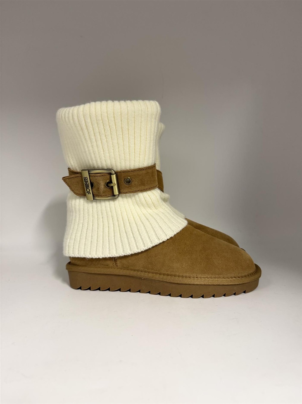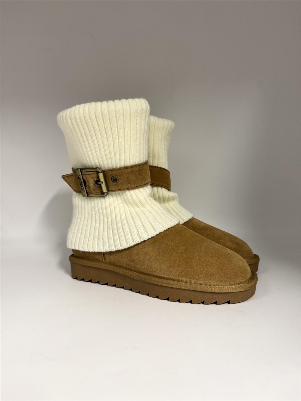 Tronchetto in camoscio beige con calzetta panna e fibbia