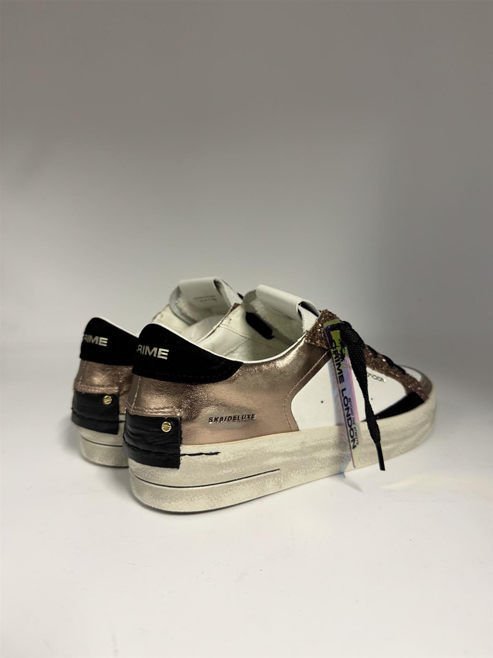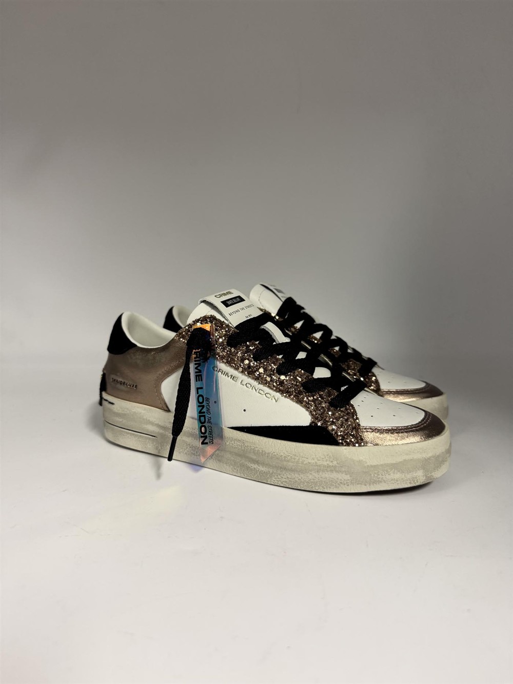 Sneaker in pelle bianca e bronzo con glitter Crime London